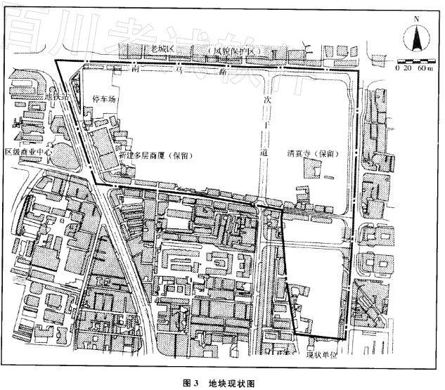 某开发建设单位申请在某大城市(国家级历史文化名城)市中心的一个地段内进行旧区改造,开发住宅、商业、办公等项目,其性质与城市规划相符。该地块面积约21.8hm2,东、西两侧临城市主干道,南侧为现状(低层)商业街,西侧为已初具规模的区级商业中心,地块周边地区;人文环境要素众多,交通繁忙,西侧主干道(二号大街)上有规划地铁线通过,地块现状如图3所示。