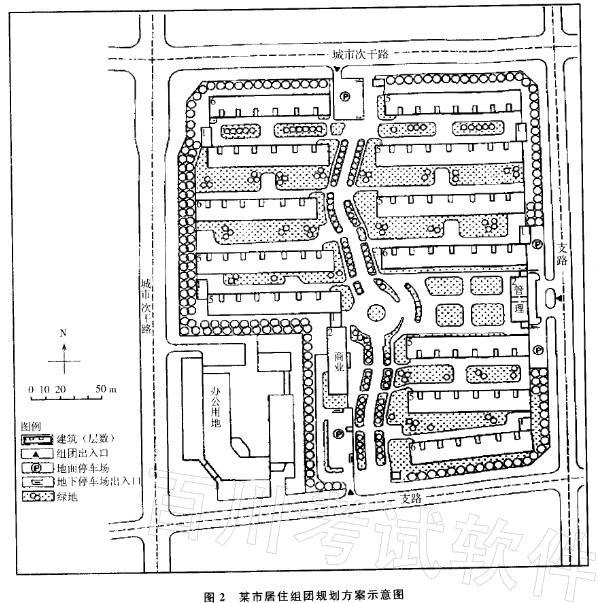 图2所示为某市一个居住组团规划方案,规划用地9万平方米,规划住宅户数800户,人口约3000。该地块西、北临城市次干路,东、南两侧为支路,在地块外西南角为现状行政办公地。根据当地规划条件要求,住宅建筑均为5层,层高2.8m,日照间距系数不小于1.4。该规划方案布置出人口安排地面和地下停车场,并有市政工程和环卫设施配套。