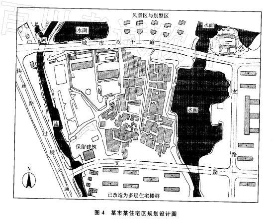 开发建设单位拟在某市城区边缘地段内建设商品住宅,其性质与总体规划相符。该项目占地约26.2hm2,其内有部分待改造的平房及工厂等;基地北侧临城市次干道;西侧为城市外围的快速路(过境交通东、南侧为已改造完成的住宅(楼房);北侧为规划风景区和已建成的度假别墅区。下图所示河流与水面已纳入市区雨水排放系统。城市规划主管部门现已给出修建性详细规划的部分规划条件(基地现状如图4所示)。