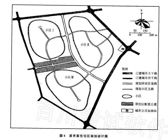 图6所示为我国南方某市近郊的一块多边形用地规划设计图,面积约80hm2,周边为已建城市主、次干路。按照分区规划的要求,应将其规划为一个可容纳4万人左右、分设为3个居住小区的居住区,并附设城市公共加油站一处(用地面积为1200m2)。