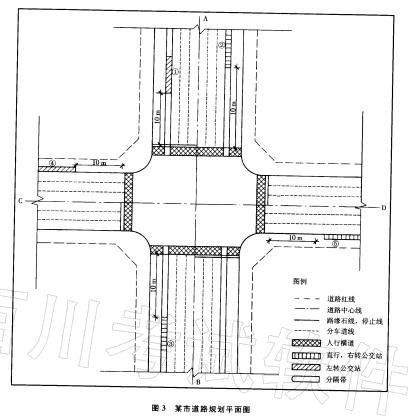 图3所示为某城市新区主干路AB与次干路CD交叉口规划平面图,规划主干路AB的横断面为双向6条机动车道三块板布置,次干路CD的横断面为双向4条机动车道一块板布置。交叉口设置了5个公交停靠站,其中②、③、⑤号站为直行、右转公交站,①、④号站为左转公交站,停靠站距交叉口距离如下图所示。
