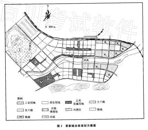 某市以省域城镇体系规划为依据拟规划发展人口规模为25万左右的一座新城市,图2所示为新城总体规划方案,经专家评审基本同意方案的框架,但对部分工业用地、居住用地以及垃圾填埋场用地等方面提出了应予改进的意见。