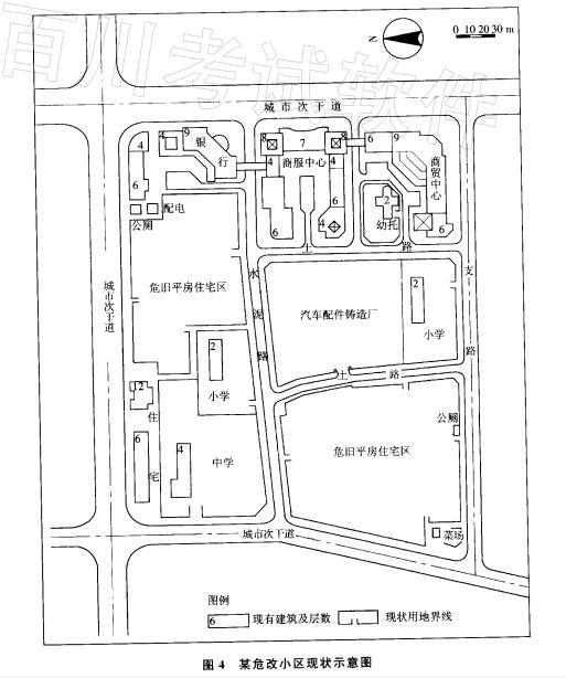 某城市小区,三面临城市干道,其南侧为支路。总用地为14.5hm2。现状市政管线已埋入道路地下,已建配电房能满足小区改建后要求。该小区用地东侧已建成金融、商业服务中心;小区西北角有2幢新建住宅褛和1所中学;另有2所小学、1处托儿所以及2片危旧平房住宅区和1处汽车配件铸造厂(如图4所示)。现已决定将此小区列为危改居住小区进行统一规划。