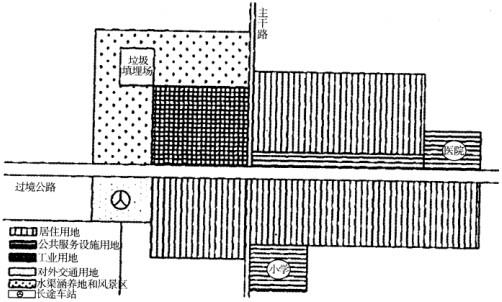 某镇区,北侧为水源涵养地和风景区,过境公路自西向东穿城而过,城区有一条南北方向的主干路。过境公路北部城区的西侧为工业,东侧为居住和商业等,布置了一个医院,过境公路南侧城区主要为居住用地,沿过境公路布置一个长途车站。在县城的南端,有一所小学。该镇为传统的农业镇,现在准备发展电解铝等产业。