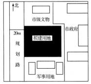 建设项目选址位置的北侧标注了“市级文物”的字样,说明了建设项目靠近文物,隐含了可能会涉及《中华人民共和国文物法》的有关规定的意思。建设项目选址位置的东侧标注了“市政府”的字样,说明建设项目邻近行政办公用地,隐含了有可能涉及安全保密问题的意思。建设项目选址位置的南侧标注了“军事用地”的字样,明确了建设项目涉及安全保密问题。建设项目选址位置的西侧标注了“规划路”和“20m”的字样,说明了建设项目临城市道路,同时说明了城市道路的等级不高,隐含了可能在交通组织方面存在问题。