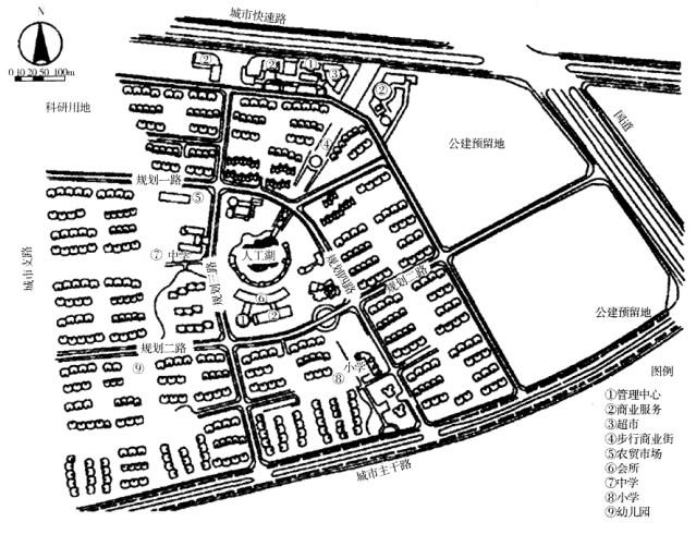 某城市居住示范小区详细规划如图5所示。居住区总用地约65hm2,居住人口约1900人,居住户数约290户。居住区位于城市中心区的东南边缘。北侧是城市快速路,南侧有城市主干路,西侧有一条城市支路,东侧是一条国道。居住区公共建设分为两部分,一部分靠近城市快速路一侧,另一部分位于整个居住区的中心位置。