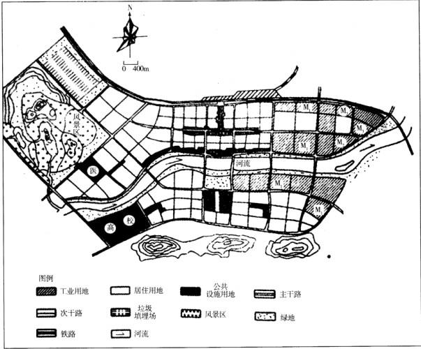 某市以省域城镇体系规划为依据拟规划发展人口规模为25万左右的一座新城市,图4所示为新城总体规划方案,经专家评审基本同意方案的框架,但对部分工业用地、居住用地以及垃圾填埋场地等方面提出了应予改进的意见。