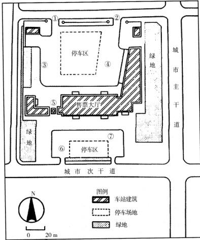请按照示意图中标明的①~⑦各点,合理组织长途客车的到、发车和城市接送旅客的进出站交通等(不含城市公共交通)。具体选择安排内容如下: