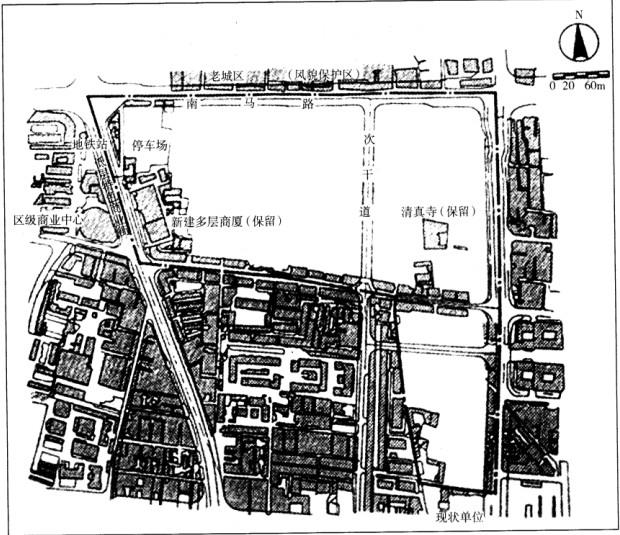 某开发建设单位申请在某大城市(国家级历史文化名城)市中心的一个地段内进行旧区改造,开发住宅、商业、办公等项目,其性质与城市规划相符。该地块面积约21.8hm2,东、西两侧临城市主干道,南侧为现状(底层)商业街,西侧为已初具规模的区域商业中心。地块周边地区人文环境要素众多,交通繁忙,西侧主干道(二号大街)上有规划地铁线通过,地块现状如图5所示。