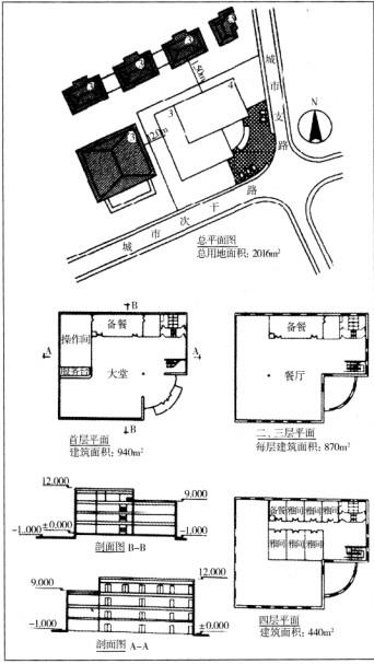 本案例包含部分建筑学知识。通过给出的建筑平面图、剖面图,获取以下信息:建筑功能为餐饮(与办公性质冲突),建筑高度13m(突破限高标准),屋顶形式为平屋顶(非坡屋顶,不符合风貌协调),内部功能空间划分情况,内部交通组织,防灾疏散情况。并可算出总建筑面积和建筑占地面积,并进行容积率、建筑密度等指标计算,看是否符合控制要求。规划方面,从总平面图可以了解建筑间距、出入口设置、停车场设置等情况是否符合规范。