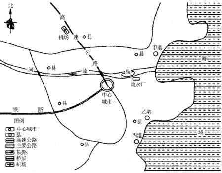 某市位于我国南部.沿海地区,市域内现有中心城市1个,一般县6个,一条河流自西向东流经中心城市北部,在中心,城市东北方向河中有一河心岛,在东部沿海有甲、乙、丙3个港口,其中甲为渔港,乙、丙为货港。