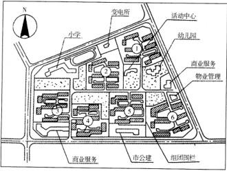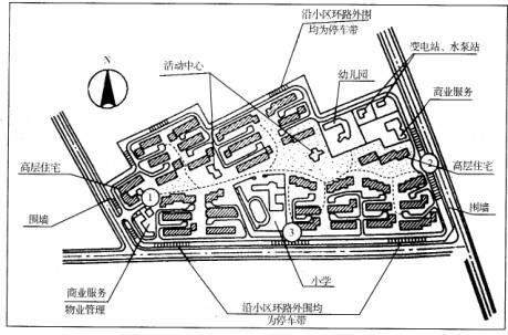小区B在居民管理方面安排了活动中心和物业管理,在整个小区的外围设有围墙来保障安全;设置了独立的行人道路,沿小区设置了环路和停车场,因此,很好地解决行人交通与机动车交通矛盾。