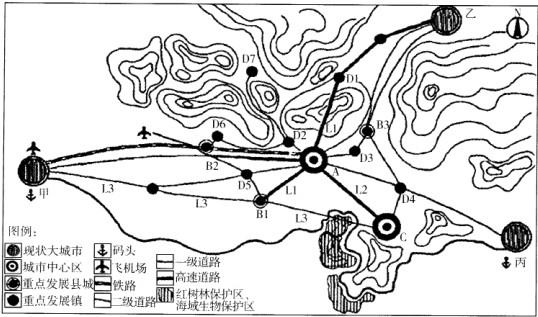 ③为促进区域协调发展规划完善道路交通体系网,拟加快环形公路网建设,重点建设L1、L2、L3三条道路,其中L1为连接B1、A及D1的高速公路,L2为B2、A及C的高速公路,L3为连接甲、B1及C的滨海道路,以加强各城镇之间的联系。