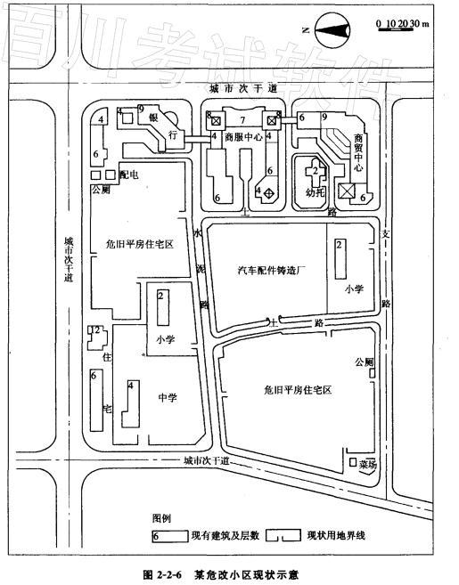 某城市小区,三面临城市干道,其南侧为支路。总用地为14.5ha。现状市政管线已埋入道路地下,已建配电房能满足小区改建后要求。该小区用地东侧已建成金融、商业服务中心;小区西北角有两幢新建住宅楼和一所中学;另有两所小学、一处幼托所以及两片危旧平房住宅区和一处汽车配件铸造厂(图2-2-6)。现已决定将此小区列为危改居住小区进行统一规划。试根据现状条件及一般危改居住小区的规划设计要求,提出需要调整和增加的主要内容。