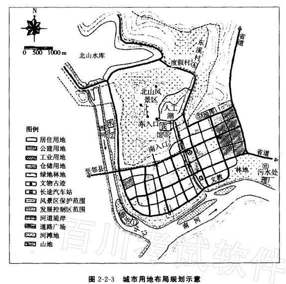 某小城市城区依山临河而建。城北为风景区(含北山水库),该风景区按规划保护较好。水库库容属中型,用作灌溉及城市水源,南河水源丰富,西河为水库泄洪道。沿河的人工提岸能满足城区防洪要求。