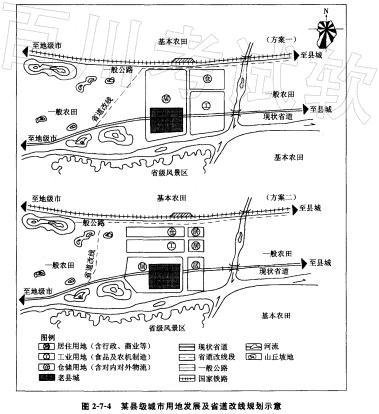 图2-7-4所示为某县级城市用地发展布局及省道改线的两个规划方案。值得注意的是该市西距入口65万的地级市40km,东距5万人口的县城30km。用地条件较好,西部为山丘坡地,东部较为平坦,水资源充沛,虽现状人口不足10万,但近些年国家铁路通车后,社会经济快速发展,省域城镇体系规划中已确定其为重点发展城市。