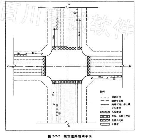 图2-7-2所示为某城市新区主干路AB与次干路CD交叉口规划平面图,规划主干路AB的横断面为双向6条机动车道三块板布置,次干路CD的横断面为双向4条机动车道一块板布置。交叉口设置了5个公交停靠站,其中2、3、5号站为直行、右转公交站,1、4号站为左转公交站,停靠站距交叉口距离如图2-7-2所示。