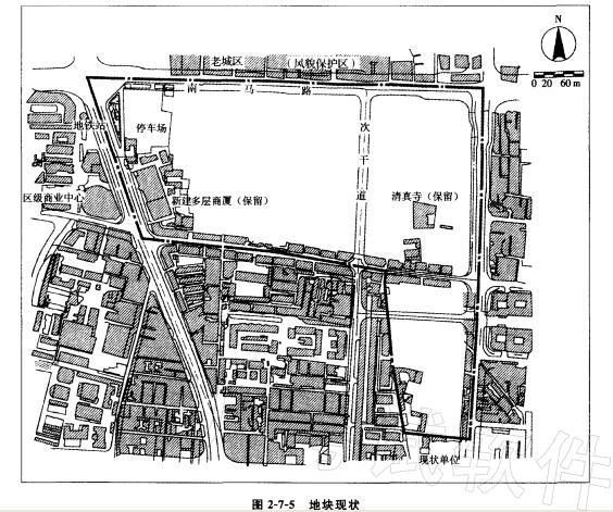某开发建设单位申请在某大城市(国家级历史文化名城)市中心的一个地段内进行旧区改造,开发住宅、商业、办公等项目,其性质与城市规划相符。该地块面积约21.8ha,东、西两侧临城市主干道,南侧为现状(低层)商业街,西侧为已初具规模的区级商业中心,地块周边地区人文环境要素众多,交通繁忙,西侧主干道(二号大街)上有规划地铁线通过,地块现状如图2-7-5所示。