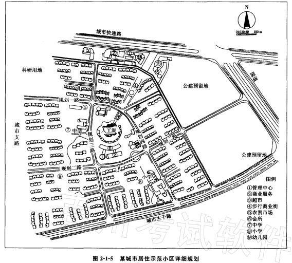 某城市居住示范小区详细规划如图2-1-5所示。居住区总用地约65ha,居住人口约1900人,居住户数约290户。居住区位于城市中心区的东南边缘。北侧是城市快速路,南侧有城市主干路,西侧有一条城市支路,东侧是一条国道。居住区公建设施分为两部分,一部分靠近城市快速路一侧,另一部分位于整个居住区的中心位置。
