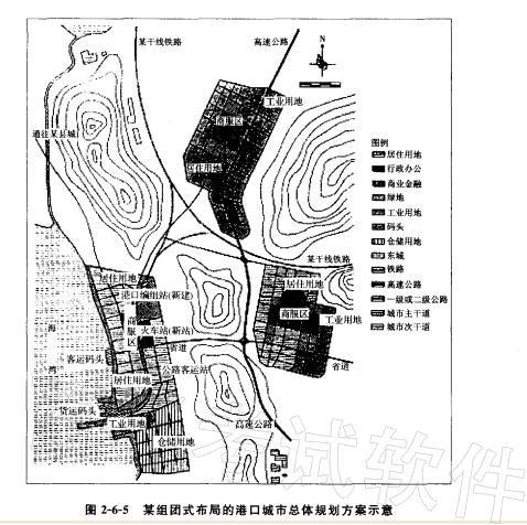图2-6-5所示为一组团式布局的港口城市总体规划方案示意图。该城市规划人口规模为65万人。港口所在组团为西区(省道以南为新发展区),东、北两个组团为新建区。有两条省道与该城市联系,其中一条为过境高速公路,另一条省道系以该城市为起讫点的一级公路,通