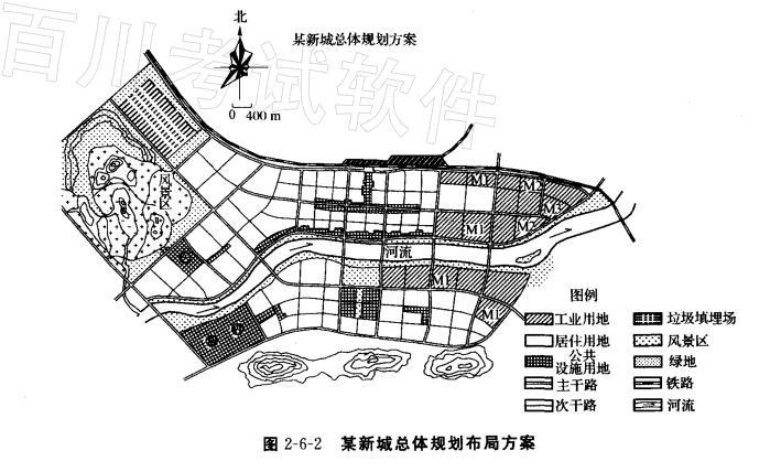 某市拟规划发展一座人口规模为35万人左右的新城,图2-6-2所示为新城总体规划方案。新城选址位于铁路客运站南侧,一条河流由东西向穿城而过。城西为风景区,城南为连绵的山脉。经专家评审基本同意方案的总体框架,但对部分工业用地、居住用地以及垃圾填埋场用地等方面提出了改进意见。