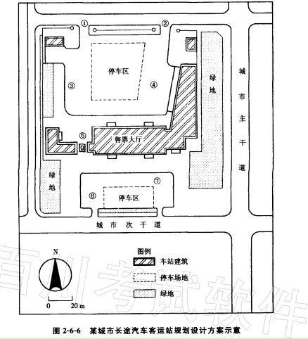 某中等城市长途汽车客运站规划设计方案如图2-6-6所示,规划用地临城市主次干道,两条干道均设置有城市公共汽车站点。该方案将长途站的长途客车间、发车区和站前广场分别布置在车站主体建筑售票大厅的两侧。