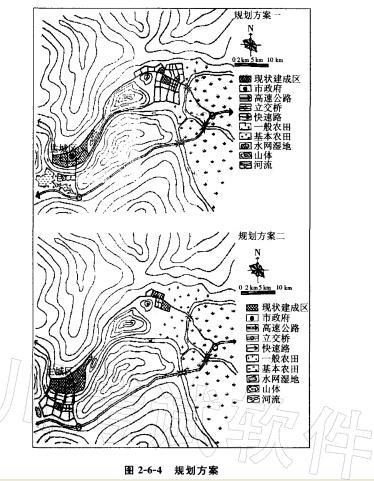 为了引导城镇建设的有序发展,市政府开展了一轮总体规划,针对城市拓展方向提出了两个比选方案(图2-6-4)。
