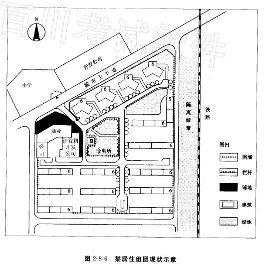 某居住组团已建成入住,现状示意图如图2-8-6所示。 请指出该居住组团规划在环境、交通及安全方面存在的主要问题。