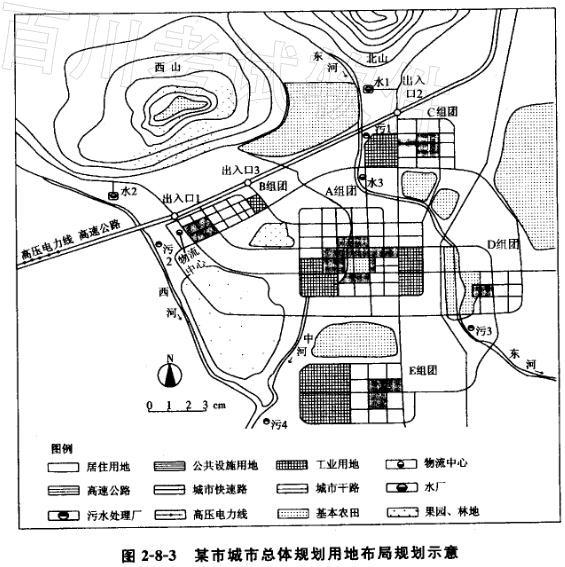 某地级市总体规划确定,主城区在现状基础上仍分为5个组团,该市地势西北高,东南低,有3条河流,主导风向东北风,主城区现状常住人口60万人,规划为90万人。城市总体规划用地现状示意图如图2-8-2所示,城市总体规划用地布局规划示意图如图2-8-3所示。