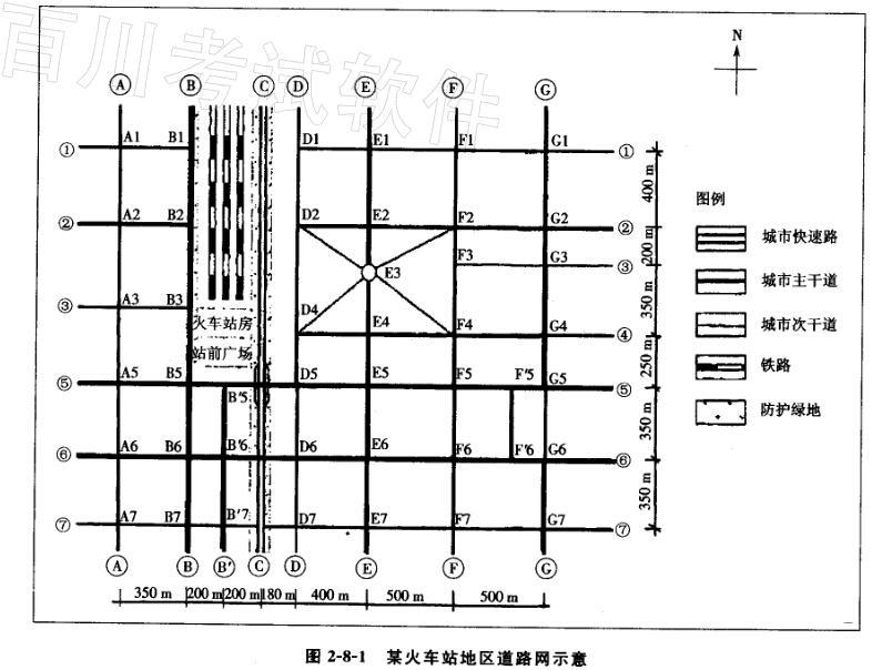 图2-8-1所示为某城市火车站地区局部的道路网布局方案示意。?—?为城市快速路,与主干道⑤-⑤交叉处已建有互通式立交,与火车站相通的南北轴线B'5-B'7为生活性干道。其他道路为城市主次干道。