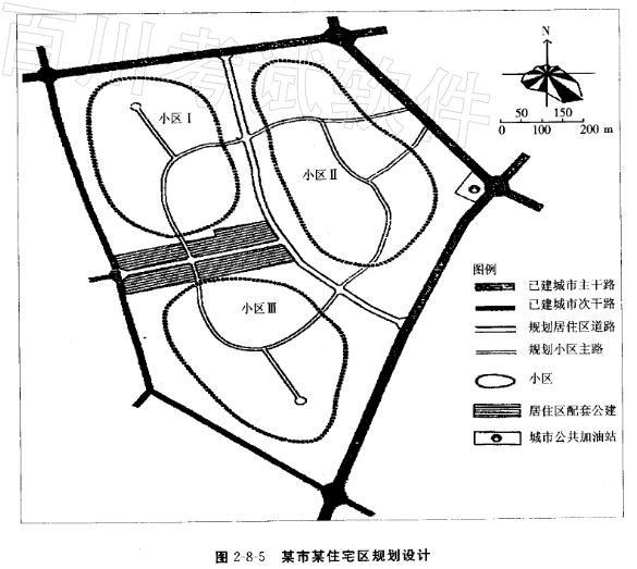 1.居住区道路和小区主路结构清晰,主要走向顺应了城市主导风向,成为居住区良好的通风走廊。 2.小区主路沟通了三个小区,联系方便。 3.Ⅱ号小区的两条主路不宜直接向城市主干路开口,且开口间距过近。 4.小区主路不宜采用尽端式道路,且长度超过规定要求。 5.城市公共加油站不宜在城市主干路及交叉口布置。