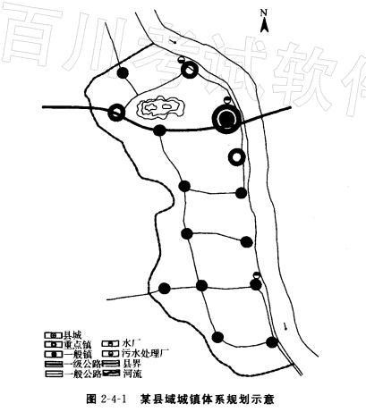 图2-4-1所示为我国东部地区滨江某县城城镇体系规划示意图,规划期为2010--2020年。县域面积480km2,经济发展水平较为均衡。规划县域总人口55万人,其中城镇人口30万人左右。规划期末县城城市人口10万人,重点镇3万人,一般镇1万人左右。带状县域向南北有较强的经济和交通辐射需求。