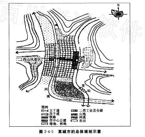 图2-4-5所示为某城市的总体规划示意图,表达了城市干道网布置与地形地貌和城市建设用地的关系。