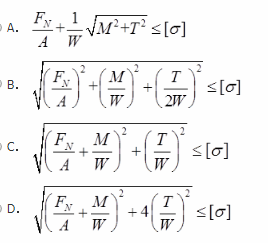 图示圆轴截面积为A,抗弯截面系数为W,若同时受到扭矩T、弯矩M和轴向力FN的作用,按第三强度理论,下面的强度条件表达式中正确的是( )。