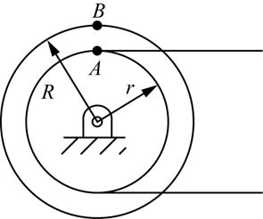 滑轮半径50mm,安装在发动机上旋转,其皮带运动的速度为20m/s,切向加速度为6m/s2,扇叶半径R=75mm,安装在滑轮轴上,如图所示。则扇叶B点的线速度和切向加速度为( )。