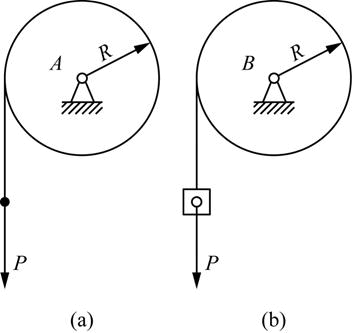 在两个半径及质量均相同的均质滑轮A及B上,各绕以不计质量的绳,如图所示。轮B绳末端挂一重量为P的重物;轮A绳未端作用一铅垂向下的力为P,则此两轮绕以不计质量的绳中拉力大小的关系为( )。