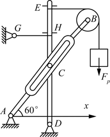 机构如图,杆ED上的点H水平绳拉住,其上的销钉C置于杆AB的光滑直槽中,各杆重均不计。则销钉C处约束力的作用线与x轴正向所或的夹角为( )。