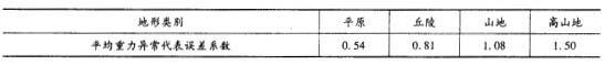 式中:δg为格网平均重力异常代表误差,单位为10-5m/s2;λ为平均重力异常格网分辨率,单位为角分;c为平均重力异常代表误差系数,各种地形类别对应的平均重力异常代表误差系数按下表的规定执行。