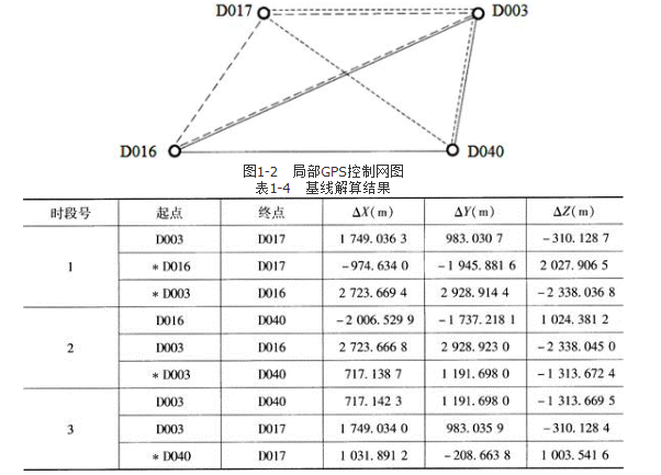 (3)外业观测与数据处理:图1-2为其中局部GPS控制网网图,采用3台标称精度为5mm+5×10-6D的接收机观测三个时段,观测计划和基线解算结果见表1-4。