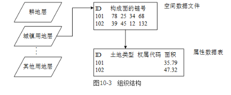 按照逻辑类型,可以把土地信息系统的数据分成不同的数据层分别进行管理(如耕地层、城镇用地层、工矿用地层、林地层、水域层、交通用地层、牧草地层、其他用地层),每个图层又包含空间数据文件和属性数据表,这两者之间通过对象ID进行关联。其组织结构如图10-3所示。