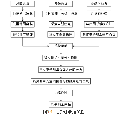 2. 电子地图制作工艺方案主要根据数据准备、数据处理、系统集成、系统调试与发行等阶段进行设计。电子地图制作流程如图9-4所示。电子地图制作分析包括数据准备、数据处理、系统集成、质量控制分析、最终成果分析。