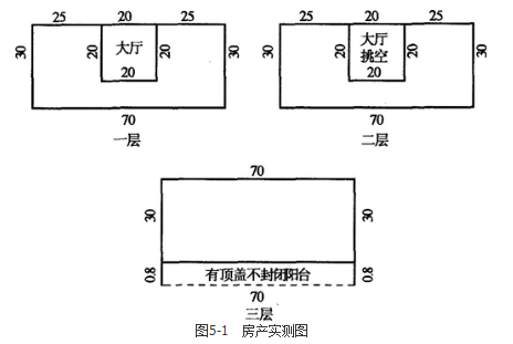 房产测量实测了新建办公楼的有关数据,包括各层的外墙尺寸、一层大厅的尺寸、二层大厅挑空尺寸和三层阳台的外围尺寸,所有尺寸不考虑墙厚,详见图5-1(单位:m)。
