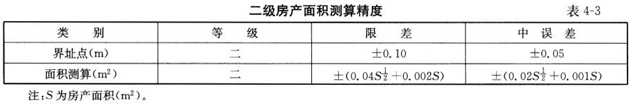 房产面积的精度分为三级,各级面积的限差和中误差不超过表4-2计算的结果。