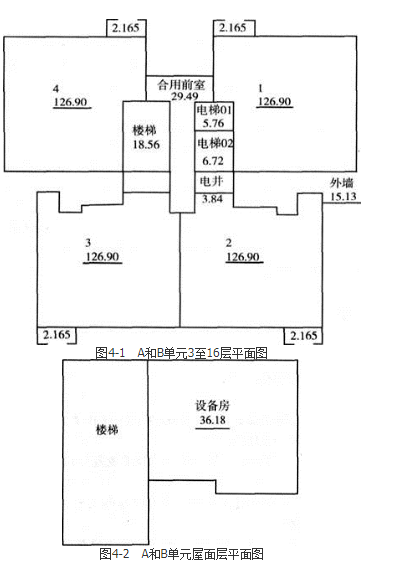 B单元1层外墙共有面积为52.26m2,电梯面积为12.48m2,大厅面积为40.5m2,管道井共有面积为6.4m2。3层以上是住宅,每单元每层共有阳台建筑面积8.66m2,公共部位共有面积39.38m2,外墙15.13m2,建筑面积642.42m2,套内面积516.26m2。屋顶层为设备用房,其公共部位共用面积为36.18m2,外墙为2.8m2。