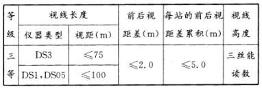 (2)设置测站的要求。三等水准测量采用尺台作转点尺承。观测应在标尺分划线成像清晰稳定时进行,若成像欠佳,应酌情缩短视线长度。测站的视线长度、视线高度等按下表规定执行。