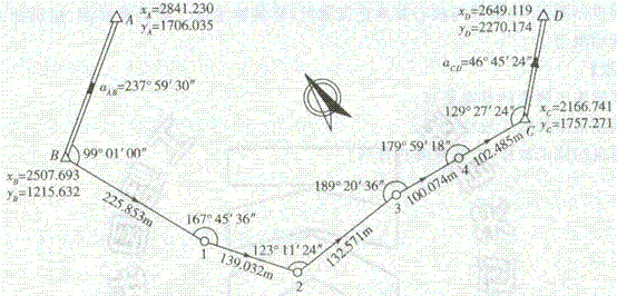 某测绘单位承担了菜机械厂1:500数字地形图测绘项目,厂区面积1.5km2,项同要求严格执行国家有关技术标准,主要包括《1:500l:10001:2000外业数字测图技术规范》HGB/T14912—2005)《国家基本比例尺地图图式第1部分1:5001:1000:1:2000地形图图式》(GB/T20257.1-2007),地形图图幅按地形分幅,规格为50cm×50cm。根据厂区的情况,布设了一附和导线进行图根控制测量,如下图所示: