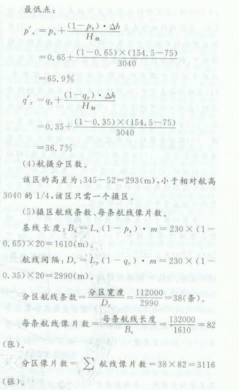 (2)当航摄比例尺小于1:7000时,分区内的地形高差不应大于相对航高的1/4(以分区的平均高度平面为摄影基准面的航高);当航摄比例尺大于或等于1:7000时,分区内的地形高差不应大于相对航高的1/6。分区内的地形高差△H=h高平均-h低平均。