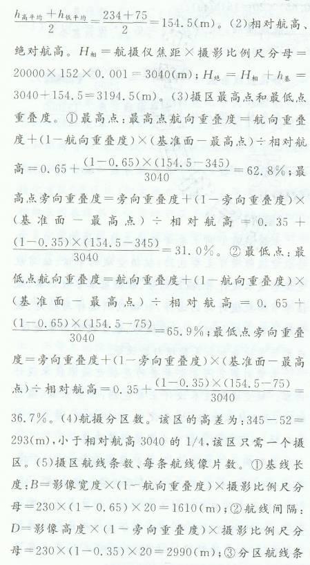 某市计划测制本地区的1:2000比例尺的地形图,前期工作是对本地区进行航空摄影。 1.摄区概况 摄区东西长132km,南北长112km,为一矩形区域,,总面积为14784km2全测区包含平地和丘陵地两种地形,其中,绝大多数是平地,约占整个测区80%的面积,主要位于测区南部的大部分地区;测区内有少量丘陵地区,主要集中在测区的北部,其面积约占整个测区面积的20%;海拔高度平地低点为52m、,摄高海拔为345m。测区内低点平均高程为75m,高点平均高程为234m. 2航空摄影基本技术要求 (1)航空摄影采用传统的航空摄影方式,航摄仪型号为Rc-30.像幅为23cm×23cm.。航描仪焦距为152mm,影像扫描分辨率为0.02mm,像片类型为真彩色。 (2)乱摄比例尺为1:20000。 (3)航向重叠要求为65%,最小不得小于60%;旁向重叠要求为35%,最小不得小于25%。 (4)航线敷设按常规的东西向敷设;航向覆盖超出测区边界线不少于2条基线,旁向覆盖超出测区边界线不少于像幅的50%。 (i)采用GPS导航.按设计坐标曝光;不敷设构架航线。 1小题> 航空摄影项目包括哪些环节? 2小题> 航空摄影技术设计包括哪些内容? 3小题> 航摄分区的原则是什么? 4小题> 根据案例计算下列摄影参数:摄影基准面;相对航高、绝对航高;摄区最高电和最低点重叠度;航摄分区数;摄区航线条数、每条航线像片数。