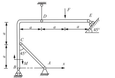结构由直杆A C,DE和直角弯杆BCD所组成,自重不计,受载荷F与M=F·a作用。则A处约束力的作用线与x轴正向所成的夹角为( )。