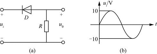 <p>二极管应用电路如图(a)所示,电路的激励如图(b)所示,设二极管为理想器件,则电路输出电压μ0的波形为( )。 <